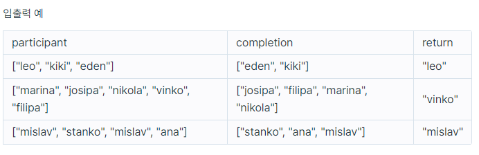 마라톤에 참여한 선수들의 이름이 담긴 배열 participant와 완주한 선수들의 이름이 담긴 배열 completion이 주어질 때, 완주하지 못한 선수의 이름을 return 하도록 solution 함수를 작성해주세요.