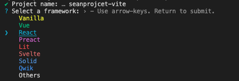 명령어 실행 후, 몇 가지 옵션이 제시됩니다. react를 프레임워크로 선택합니다. 이는 프로젝트가 React 기반으로 구성될 것임을 의미합니다.