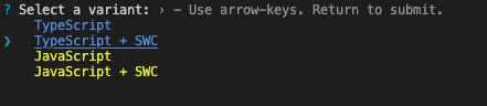 추가적으로, Vite는 최신 JavaScript 변환 도구인 SWC를 지원합니다. 이를 사용하려면, 해당 옵션을 선택합니다.