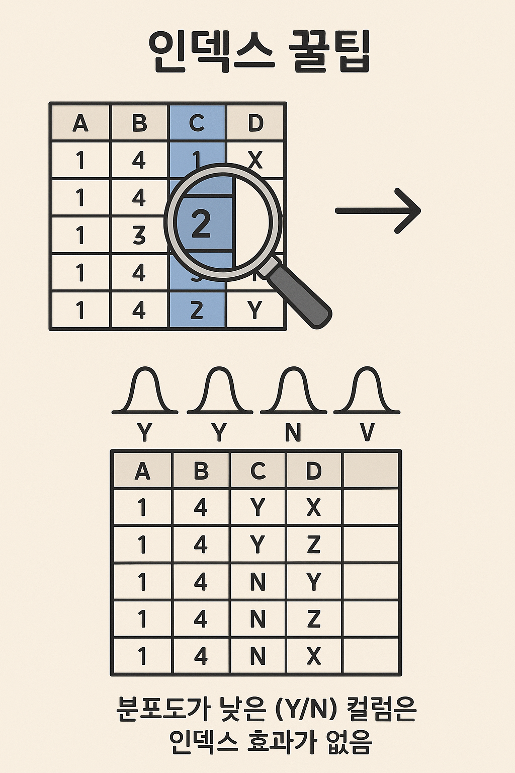 - 데이터 분포가 다양한 컬럼이 효과적 (예: 주민번호, 이름 → Good / 성별, YN → Bad)