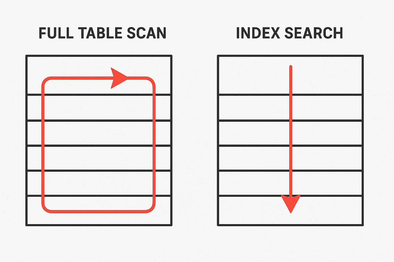 인덱스 없이는 Full Table Scan (처음부터 끝까지 검색)이 발생합니다.