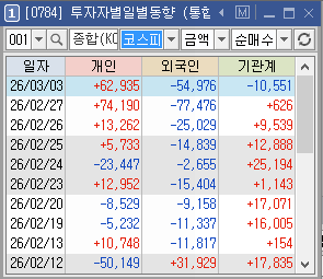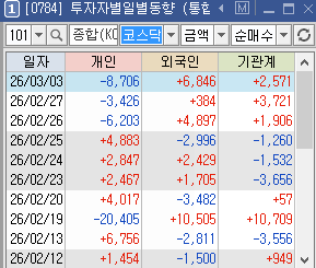 - 코스피: 개인 +6조 / 외국인 -5조 / 기관 -1조